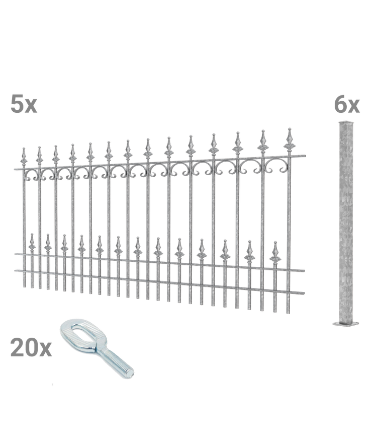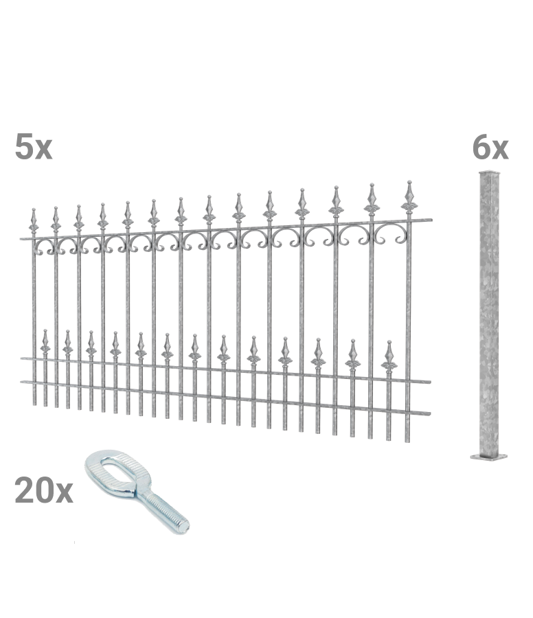 A “Lucca” il delicato romanticismo incontra il robusto ferro battuto. "Lucca" ha una larghezza standard di 192,5 cm e un'altezza di 90 cm. La recinzione colpisce per il suo aspetto elaborato, la decorazione curva a C e le eleganti punte a forma di giglio sferico. È realizzato in ferro battuto solido e resistente alle intemperie. Il set di recinzione comprende: • 5 elementi di recinzione modello “Lucca” da 192,5 cm • 6 pali da avvitare o da cementare • 20 viti con intaglio per pali in acciaio