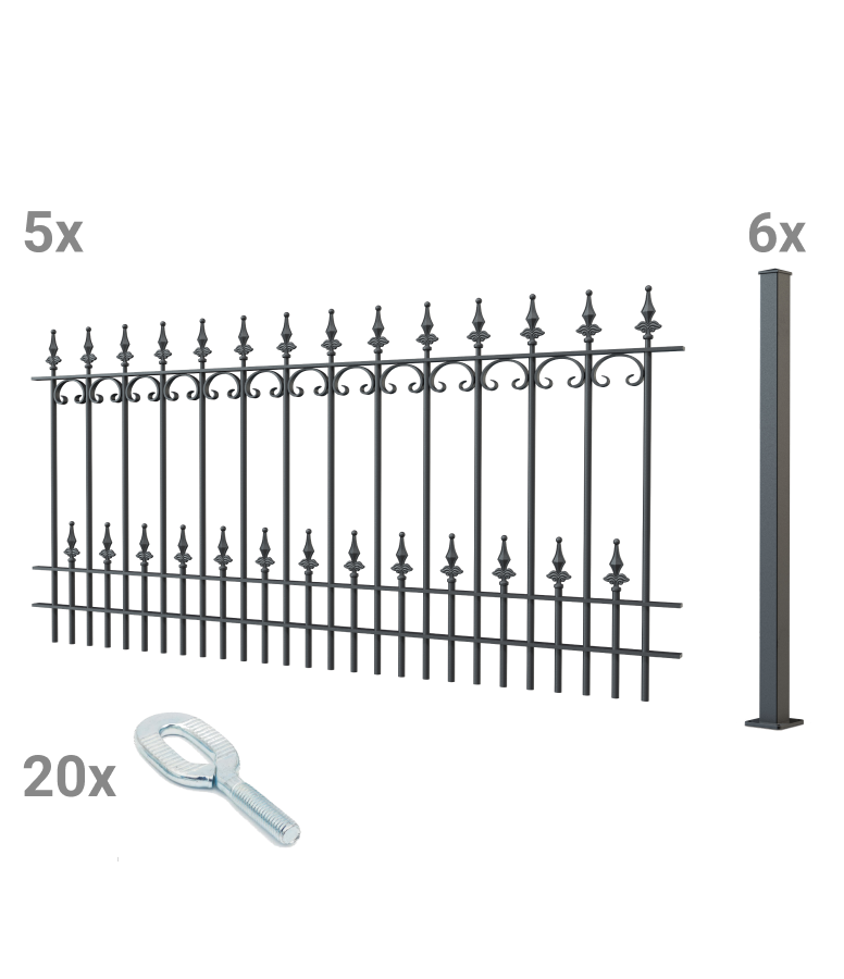 A “Lucca” il delicato romanticismo incontra il robusto ferro battuto. "Lucca" ha una larghezza standard di 192,5 cm e un'altezza di 90 cm. La recinzione colpisce per il suo aspetto elaborato, la decorazione curva a C e le eleganti punte a forma di giglio sferico. È realizzato in ferro battuto solido e resistente alle intemperie. Il set di recinzione comprende: • 5 elementi di recinzione modello “Lucca” da 192,5 cm • 6 pali da avvitare o da cementare • 20 viti con intaglio per pali in acciaio